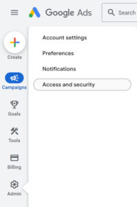 STEP 2: To add a new user to your Google Ads account click on “Admin” on the left and select “Account access and security”.