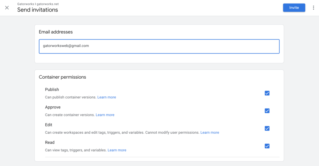 STEP 4: Enter gatorworksweb@gmail.com into the Email Addresses field, select the “Publish” permissions option, and click “Invite”
