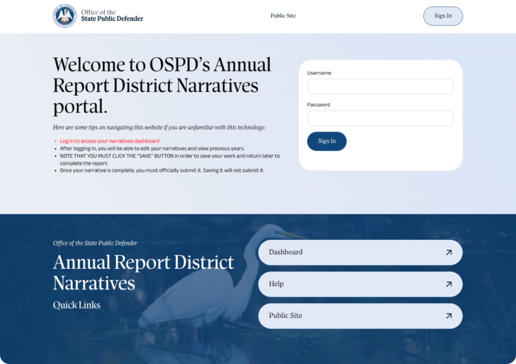 In addition to redesigning their main website, the Office of the State Public Defender approached us with a need for a more efficient internal tool. Their team had been relying on a spreadsheet to collect and manage annual data submissions—but over time, it became clear that the system was no longer meeting their needs. We worked closely with them to develop a custom online portal that replaced the spreadsheet with a structured, user-friendly form. The portal allows multiple user accounts and is designed to support secure, accurate, and consistent data entry from each parish, streamlining their internal reporting process.
